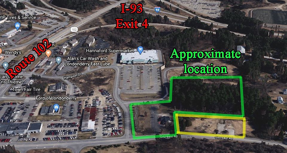 Two commercial lots totaling 7.42 acres +/- is available. One lot with frontage on Gilcreast Road has existing structure (2,162 +/- SF) used for many years as restaurant. Second vacant lot also has frontage on Gilcreast. Additional access may be possible off of secondary roads. It is located just seconds from highly sought after Exit 4, I-93 and shares retail/commercial vacinity with Hannaford's, Town Fair Tire, Ford of Londonderry, Home Depot, McDonald's, Wendy's, etc. Public water and Sewer. Commercial zoning. $3,000,000
