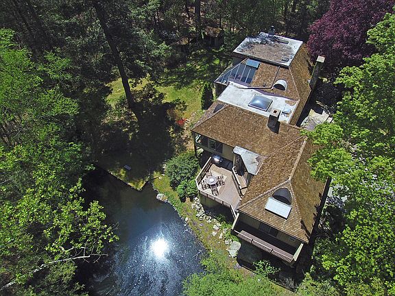 Exceptional modern home in bucolic county setting on 2.38 private acres with cedar shingle roof, stone walkways, mature trees, and Trex deck overlooking scenic pond, yet approx. 60 miles to NYC. Light and open with 4,121 square foot, 4 bedroom, 3/1 baths, 3 fireplaces, skylights, and walls of glass. Over $120K of recent improvements including: new Lenox heat and central air with WIFI thermostats; hybrid hot water heater; hardwood flooring; 20 Kw Generac automatic generator; interior/exterior paint; Quadra Fire Castile wood pellet stove insert; and more. Updated chef's kitchen with prof. gas range/hood; double wall ovens, and center island with bar seating, open to charming den with fieldstone fireplace and built-in shelving; plus adjoining family room/sun room with built-in wet bar/wine refrigerator, walls of glass and vaulted atrium glass ceiling. The main level also features the large living room with dramatic floor to ceiling fieldstone fireplace; formal dining room with skylight and built-in buffet; bright office/studio with French doors to the rear deck for outdoor enjoyment; plus three main level bedrooms, two full baths, and convenient laundry. Walk up to the private second floor master bedroom suite with 3rd fireplace, huge walk-in closet, and updated spa like bath with double vanities, separate shower and soaking tub, plus don't miss the sauna! Spacious unfinished lower level with workshop, attached 2 car garage, and more. Once the home of famed artist Howard Terpning who captured the beauty of the natural surroundings in some of his paintings.