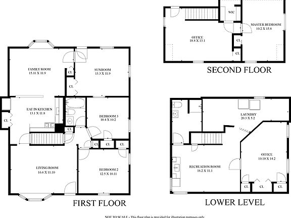 - Level 1 Rooms: Kitchen, Living Room, Family Room, Sunroom, Bath Main, 2 Bedrooms