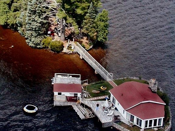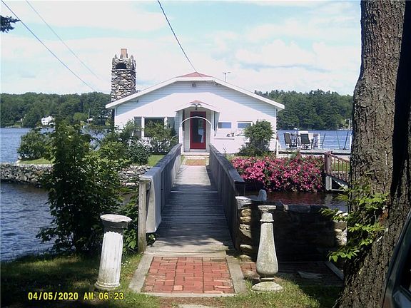 This property is located on> OTIS RESERVOIR, OTIS MASS<. Own your own island! 360 degree views! One of a kind home on Otis Reservoir. 1,000+ acre lake that's 3 miles long. Considered to be the largest recreational body of water in Western Massachusetts. Power boats up to 25' and 200 hp max, must stay at least 150' from property line. A one hundred foot bridge leads to a 10,320 sf island with 360 degree water views. The dam was rebuilt in 2012 with a spillway. 34x19 southern facing sundeck with awning, dock with two launch areas. Boathouse, raised sundeck and stone chimney and stone retaining walls. Inside living/dining room with picture window, hardwood floors, birchwood paneling and a stone fireplace. Eat-in kitchen has gas oven range. Slider to the south facing deck. Back of house has a fantastic 29x14 four-season sunroom/greatroom with 180 degree lake view. Two bedrooms and one full bathroom. House was built in 1932 on a man-made island. The mainland has a garage. A heated pellet stove workshop building and parking for 15+ cars. Might be possible to build new on the mainland. Sale includes .04 acre property at 47 Hayre Island Road. Buildings need repair and renovation or tear-down and build new. Well water, septeic required. NOW priced BELOW market value!
