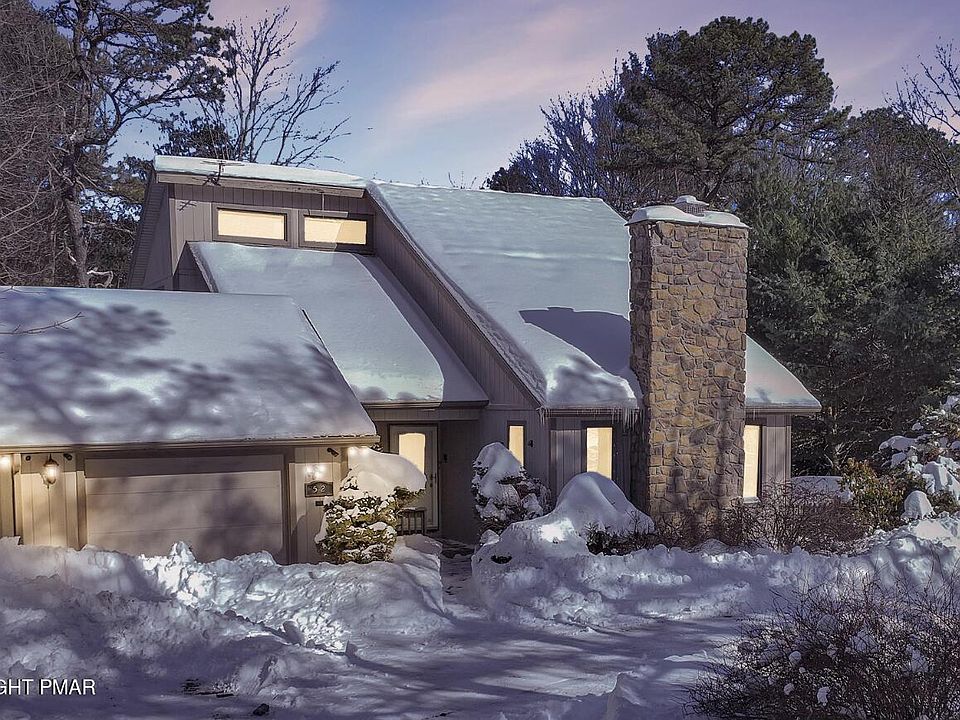 Beautiful contemporary mountain home offering 3 bedrooms, 2 full baths, a loft, and a garage, ideally located in Lake Harmony with access to the community's powerboat lake. Set on a peaceful, wooded lot, this home showcases classic Pocono architecture with dramatic rooflines, large windows, a stone chimney, and a welcoming covered porch—perfect for enjoying the natural surroundings.