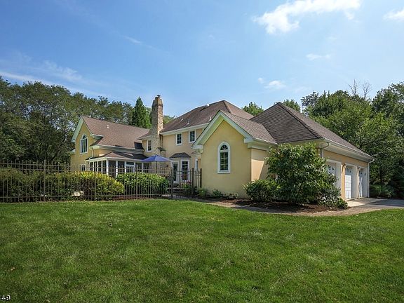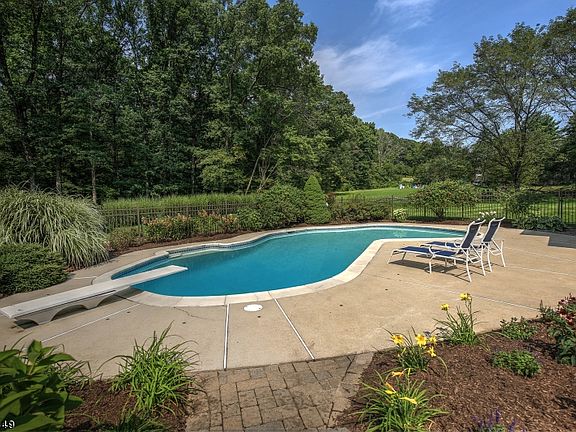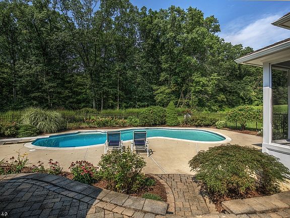Take in the peace and tranquility of country living in this French-inspired brick home. Situated on almost four level acres, the scenic property has profuse plantings, tall trees, a small pond and mature woods along its rear boundary. This well-maintained home shows pride of ownership as well as originality. Designed with comfort in mind, its layout is warm and welcoming. Originally a builder's own home, it was constructed using three layers of plaster over wire lath construction. In 2004, noted local architect Ed O'Brien was engaged by the current owners to expand the space. At that time the windows were replaced and mechanical systems were updated. Interior details include custom cabinetry in the billiards room, hardwood floors, solid wood doors, crown moldings and light-filled spaces. A good balance of formal and informal rooms serve a variety of interests and occasions. Enjoy summer days poolside from a screened porch adjoining an expansive tiered paver patio. The stone floor and wainscotted ceiling add distinction and personality to this three-season room. The plaster pool is elegantly enclosed by ornamental fencing which protects the garden beds. Entertain a crowd or enjoy quiet moments in this peaceful setting. The thoughtfully-placed full bath/changing room accessed from the patio is another convenient feature. Introducing the home is a foyer with picture frame detailing and embellishments. A beautiful step-down garden room with ceramic tile flooring is topped by a dimensional coffered ceiling. It adjoins a family room centered by a wood-burning stone fireplace. This level continues with a home office, billiards room with built-ins, airy sun room and formal dining room with raised wood panels below chair railing. Design elements in the kitchen include a gas fireplace, maple cabinetry and granite countertops. Leading from the kitchen is a mud room with closet, a transitional space connecting to the attached garage. Upstairs, five bedrooms, three full baths, a laundry room and plentiful closets easily accommodate family and guests. The expansive master suite offers an en suite master bath while an additional bedroom is also en suite. In 2004, extra recreational space was created in the finished basement with a full bath. A three-car attached garage and enormous paved parking court complete this exceptional home. Located minutes from Oldwick in Tewksbury Township, highlights of the area include excellent Blue Ribbon schools, quaint boutiques and a relaxed quality of life. Sports activities are abundant for riders, golfers, hikers , and bicycling enthusiasts who love the rolling countryside roadways. Whittemore Sanctuary and Christie Hoffman township park host many outdoor events and activities while there is outstanding fly fishing at nearby Ken Lockwood Gorge, as well as dedicated hiking trails and the Tewksbury Trail System for horseback riding. Commuters are close to I-78, mass transit options and corporate campuses, Newark Liberty International Airport and easy access to New York City.