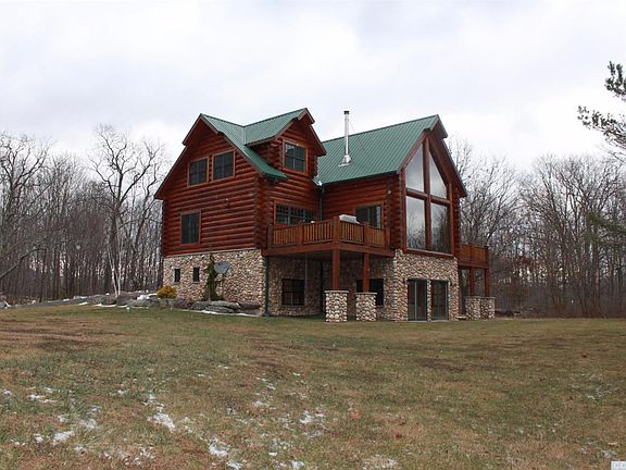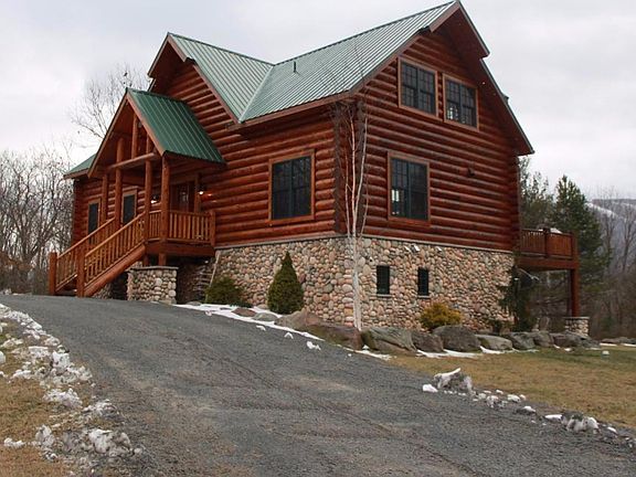 Spectacular 3700 sq ft master-crafted log home less than 2 hrs 15 mins from NYC. Constructed with only the finest premium materials. Great room w/vaulted ceiling, Vermont Casting wood stove and soaring 16' wall of glass facing Windham's ski trails. The casual country kitchen boasts custom farm style cabinets and sink, soapstone counters, breakfast bar and 6 burner Wolf stove. Powder room with copper sink and custom wood pedestal. First floor master en suite offers walk-in closet & doors leading to private deck with mtn views. Gorgeous 150 yr old rough sawn wide plank barn wood floors. 2nd fl with 2 bedrooms and full bath with Jacuzzi tub and tumbled marble floor.The full walkout basement serves as a bright guest apartment offering the same high quality materials and fine craftsmanship as the main levels of the home. 11' ceiling height, LR with gas fp, full kit with soapstone counter and Induction cook top. 2 BRs (1 w/out closet per code) and Full Bath. 5 mins to slopes! Borders DEP!