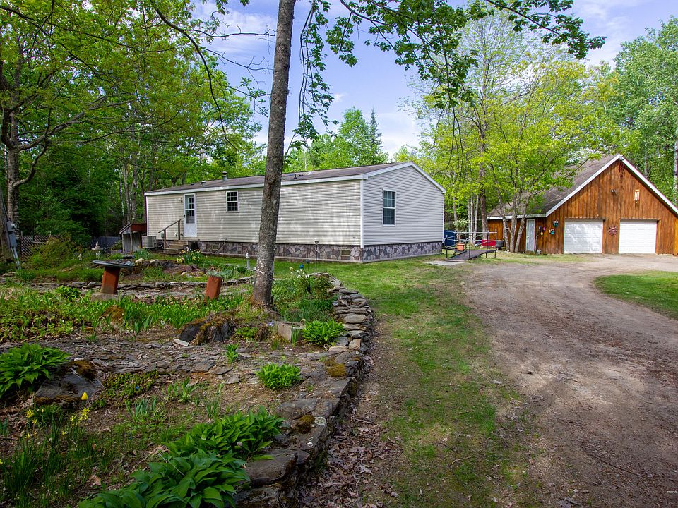 This double-wide is neat and tidy, roomy, efficient to heat, and has considerable extras like: 2 car garage with storage above and an 8x28 enclosed addition; a heated shed with an 8x8 chicken house attached that comes with chickens; an exceptional landscape of stone walls and staircases, raised garden beds, and beautiful perennial gardens; ramp access into the home; and ducted air conditioning. Situated just far enough off Route 202/9 to minimize traffic noise yet less than 40 minutes to Bangor, Waterville, Belfast and Newport makes it a great location. Fiber Internet is available at this location.