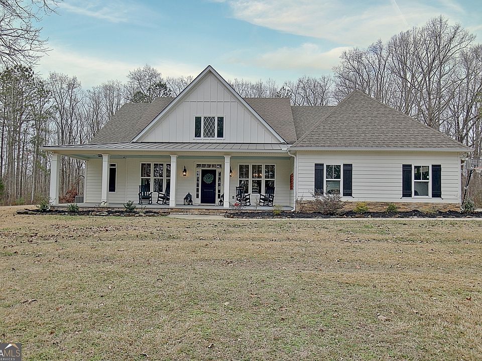 TIMELESS SOUTHERN ESTATE ON 10+ PRIVATE ACRES IN NEWNAN Welcome to refined southern living in this meticulously crafted home, where classic architecture meets contemporary comfort across 10+ private acres. A quintessential rocking chair porch invites you into this distinguished estate, where thoughtful design and premium finishes create an atmosphere of timeless elegance. The heart of the main level showcases a stunning great room with a dramatic floor-to-ceiling shiplap fireplace and custom built-ins. The adjacent chef's kitchen is a culinary masterpiece, featuring a gathering island, premium granite surfaces, custom cabinetry, and stainless appliances. A formal dining room comfortably accommodates intimate gatherings and memorable celebrations, while a sophisticated library or office provides a private space for remote work or quiet contemplation. The luxurious primary retreat offers MAIN-level living at its finest, complete with a spa-inspired bath featuring a soaking tub, dual vanities, and designer granite finishes. A separate suite on the MAIN level includes a full bath adorned with custom tile work and exotic granite surfaces. Upstairs, two generously sized bedrooms share a pass-through bath with granite countertops. An expansive BONUS room and versatile FLEX SPACE provide endless possibilities for a media room, home gym, or additional living area. Throughout the home, premium features abound including hardwood floors, soaring high ceilings, extensive crown molding, and designer fixtures. Step outside to discover your private oasis, centered around a resort-style SALTWATER POOL with a tranquil waterfall feature. A two-car DETACHED garage with WORKSHOP space and private gated drive complete this exceptional property. This distinguished estate offers the perfect blend of privacy and sophistication, just minutes from Newnan's historic downtown. HSA WARRANTY INCLUDED!