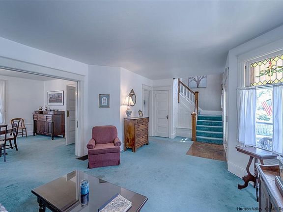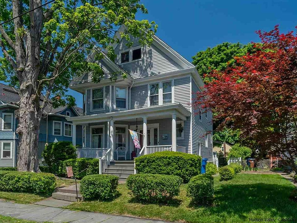 This 1920's Home with great charm and character is located on a quiet tree lined Uptown Kingston Street just blocks from the Historic Stockade area and totally walkable. This home with loads of curb appeal has a rocking chair front porch perfect for the morning coffee and greeting friends. It's the way life used to be. A gorgeous original front door with stained glass side lights welcomes you as you enter into a large living room and adjacent diningroom with windows all around giving this home great natural light. Some other details that make this home special are original moldings and doors, original brass doorknobs, stained glass windows, wood floors(under carpets) and pocket doors. Off of the kitchen there is a 1st floor laundry room with a nice 1/2 bath and sliders to a 27x12 Deck overlooking an extra deep level fenced yard. A beautiful front banister takes you up to the second story with a nice open landing. The full bath has an original claw foot tub. There is an easy walkup to a huge attic with high ceilings which would make a great studio space or to use for just plain storage.