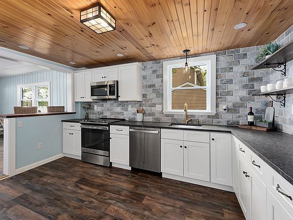 WATERFRONT! Welcome to your dream LAKESIDE HOME, where everyday living meets extraordinary views! The well-designed layout seamlessly connects the living, dining, and kitchen areas, creating an inviting space for daily living and entertaining loved ones. The spacious kitchen has leathered granite countertops, tiled backsplash and new appliances. The living/dining area overlooks the water, opening onto the open porch where you can take in the vibrant sunsets every evening! Upstairs are two bedrooms and a small sunroom, each offering its own captivating vista of the lake. The full bath is well-appointed with an elegantly tiled shower and dual vanity and there is a half-bath with laundry off the mudroom. Enjoy water activities on Lake Attitash from your private dock--kayaking, boating, fishing, swimming or even ice-fishing in winter! WATER VIEWS FROM EVERY ROOM! New heat/AC, new vinyl plank flooring throughout, new windows/doors, new plumbing, new 200-amp electric and more!