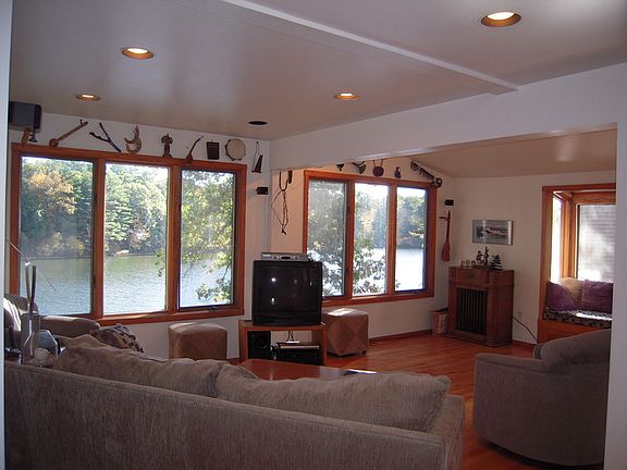 Waterfront on Lake Boon's desirable 1st basin. Beautifully cared for with lots of glass to take in the water views. Spacious open floor plan, fully applianced kitchen, hardwood floors, clean updated bathrooms and first floor laundry. Enjoy the year round entertainment living on the water...swimming, boating, fishing, cross country skiing and pond hockey! About 25 miles west of Boston.