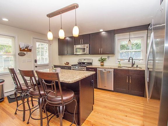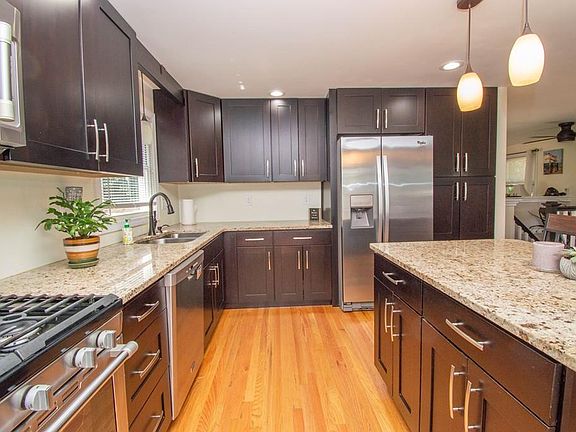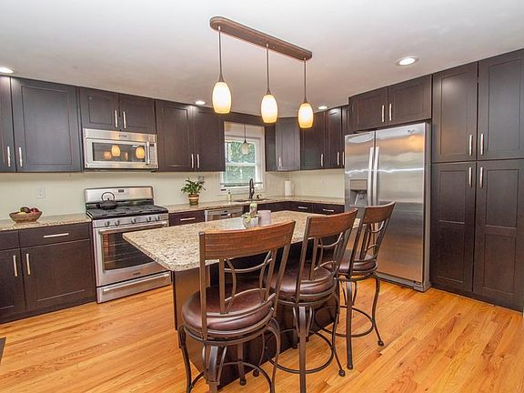 RENOVATED LUDLOW HOME WALKING DISTANCE FROM CHILDREN'S PARK!! This three bedroom raised ranch is sure to impress!! Open floor plan and many upgrades throughout! Hardwood floors upstairs and brand new laminate flooring downstairs!! Kitchen has dark cabinets with light granite, stainless steel appliances and three person island! Living room has wood stove and sliders leading to back deck overlooking the wonderful yard! Downstairs has all bedrooms with large windows for natural light! Detached one car garage and fully fenced in yard. Make your appointment today!!!!