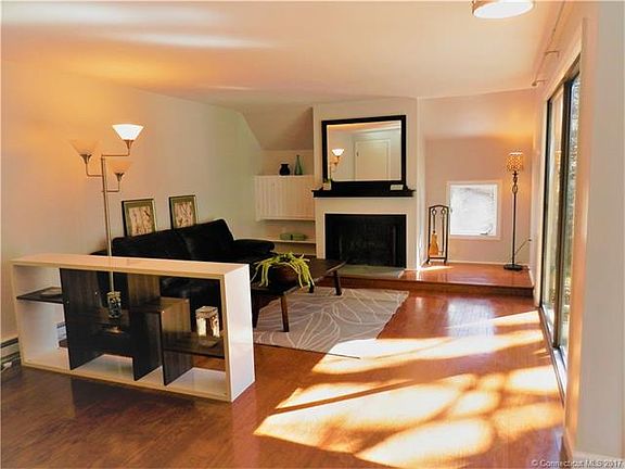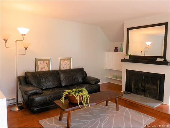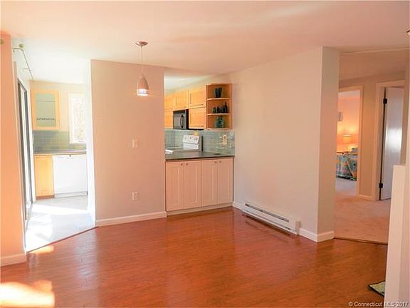 Extremely rare 2 bedroom first floor ranch in River Colony! This complex is within walking distance to Guilford Green, convenient to I-95 and nestled close to the West River. Refurbished throughout unit, kitchen floor has brand new glazed porcelain tile and gorgeous glass tile backsplash to compliment sleek horizontal lift-up cabinetry and glass sliders which bring nature into the space. Two sets of sliders adorn walls in kitchen and living room, looking out to private stone patio, to simultaneously bathe the unit in natural light and showcase the beautiful landscape, giving a peaceful sense of serenity. Another focal point of the living and dining space is a wood burning fireplace flanked by nooks and built-ins. The two spacious bedrooms have ample closets and are perfectly situated outside a nicely-sized hall and small full bath. Finally, unlike most units, this includes a utility/laundry closet containing a Splendide Washer-Dryer Combo which allows you to go from wash to dry automatically using a highly rated machine that is described to have an exclusive sound dampening system. Complex allows domestic pets but NO dogs.