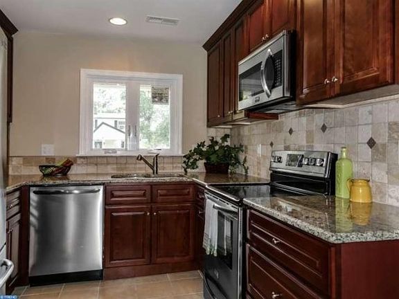 DEAL OF THE SUMMER! This 5-bedroom, 2-full bath contemporary home was thoughtfully renovated all the while keeping its charm! A paved walkway welcomes you to this home with brand new central air/heat pump! The gleaming floors of the entry hall attests to the craftsmanship of the rest of the home. To the left is a full bath boasting a full-tiled bath/shower combo (notice the meticulously detailed tiled accent strip). The warmth of a dark wood, single-bowl vanity enhanced with a white marble-look counter top, sleek, wood mirror and quality fixtures everywhere lends plenty of style to this bathroom. A near-by stackable washer/dryer will make laundry a breeze. Directly down the hall, you enter the family/dining room with its rich wood flooring, softly painted walls and a beautiful spindle staircase. A low-maintenance sliding glass door takes you out onto a paver patio large enough to imagine evenings of alfresco entertaining around a wood-burning fire and kicking back. A large, flat yard is spacious enough for plenty of flower gardens/vegetable garden and easy mowing. A meticulously detailed kitchen is to the left of the family/dining area. The soft patina of the richly detailed Windsor-style kitchen cabinets with their 'soft close' doors, the ample counter space of richly grained granite enhanced with the uniquely designed tile backsplash, the softness of the tile flooring, stainless steel appliances (notice the French-door refrigerator/freezer), recessed lighting and quality fixtures. A 'to die for' three-season sunroom is off the kitchen. This room says, 'throw open the windows, put on some music, set a table for a quiet evening of dining. Two bedrooms complete the downstairs. One bedroom could be used for an office or play room. Both are light-filled and spacious. SECOND LEVEL: THREE BEDROOMS UPSTAIRS. A rare find! All three bedrooms are richly carpeted, painted in soothing colors, light-filled and spacious. A full bathroom with full-tiled shower with tile accent strip, beautiful dark wood vanity, tile floor, recessed lighting and plenty of natural light. HIGHLIGHTS: Thoughtfully and meticulously renovated with quality materials and workmanship. New central air/heat pump, completely renovated kitchen and bathrooms. A large, flat yard with patio, a three-season room. This is a beautifully renovated home with distinctive features for everyone. This home has been lovingly renovated and is in 'like new/move-in' condition.