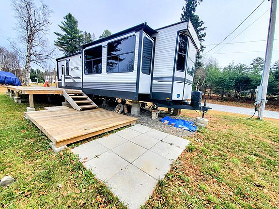 The property comes with a fully equipped 2022 turn-key Retreat camper, outbuildings, public water, and private septic, ready for you to enjoy immediately - or bring in a mobile home to create a more permanent residence while the camper serves as a cozy guest retreat. Step out onto the spacious deck to relax and soak in the sights of Maine's stunning wildlife, or take to the water with the included pedal boat, kayaks, and paddle board, so your adventures can begin the moment you arrive.