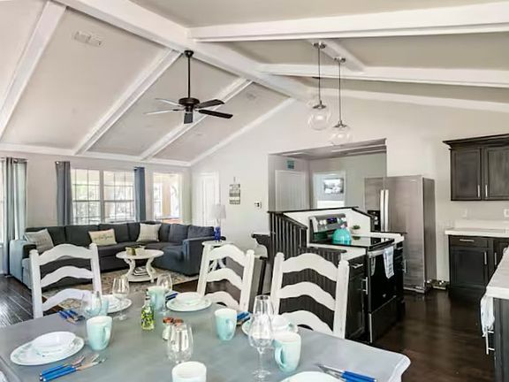 The kitchen features newer stainless steel appliances including a refrigerator with filtered water, microwave, blender, toaster, coffee maker, and electric kettle. With dinnerware and seating for 16, you'll have everything you need to cook and enjoy a delicious meal.