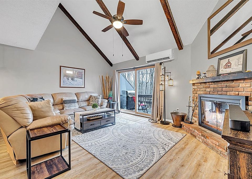 This cozy cabin style townhouse is located in The village at Camelback located right on Camelback Ski Mountain steps away from all the attractions and ski slopes. AIR CONDITION IN EACH ROOM Beautifully renovated townhome with a modern flare and just steps away from the ski slopes at Camelback Resort. Open concept living/dining area great for entertaining. Kitchen is well equipped with stainless steel appliances and a large island. Three spacious bedrooms, two full baths and half bath make this property a great getaway. Community Provides Indoor swimming Pool, Hot Tub,SPA, Indoor basketball/Tennis court, pickle ball,Gym and more. House is renovated and painted recently.