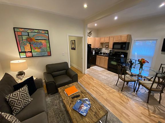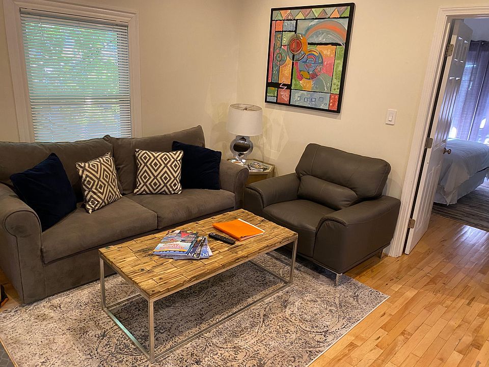 Spacious bedroom with a queen bed, large closet, and French doors leading to the red brick patio, and living area with a comfortable, full size sofa bed, gorgeous stone kitchen countertops, gas range, eat-in kitchen, high ceilings, glass enclosed shower, hardwood floors, bright, super quiet, safe and clean, and mostly, private.
