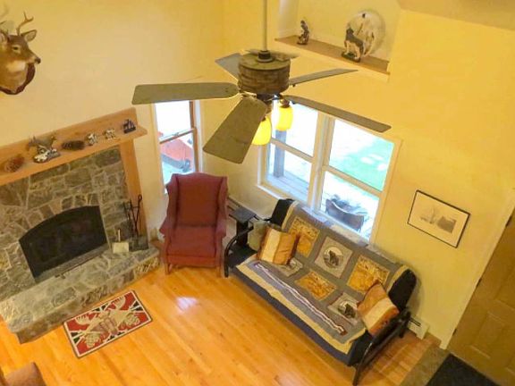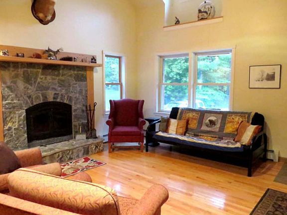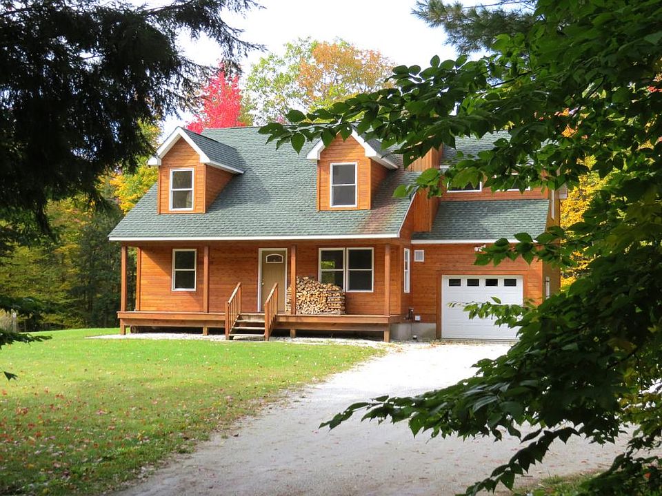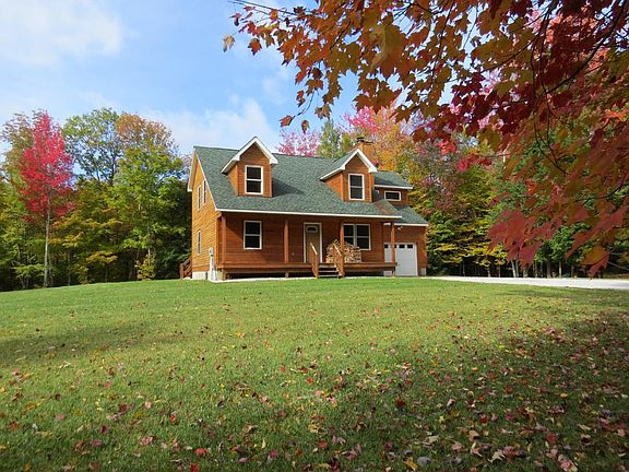 TUCKED AWAY on a private lane, this CONTEMPORARY CAPE style home boasts a HANDCRAFTED STONE FIREPLACE with insert (can heat the whole house!), CATHEDRAL CEILING, HARDWOOD flooring in living room; TILE FLOORS in mud room, kitchen, baths and dining room. Main level has DEN and LAUNDRY. RADIANT HEAT in garage and basement (semi-finished) and BB hot water throughout. FARM STYLE PORCH for relaxing and PRIVATE DECK out back. TWO GARAGES: 1 attached on main level and one in back for TOYS. BASEMENT SEMI-FINISHED--26x15 area...8 foot ceiling, insulated walls, some sheet rock...perfect for FAMILY ROOM with FRENCH DOORS leading to landscaped yard. FENCED RAISED BED GARDEN too. Near the Tinmouth Channel. VTEL FIBER OPTIC INTERNET in place!