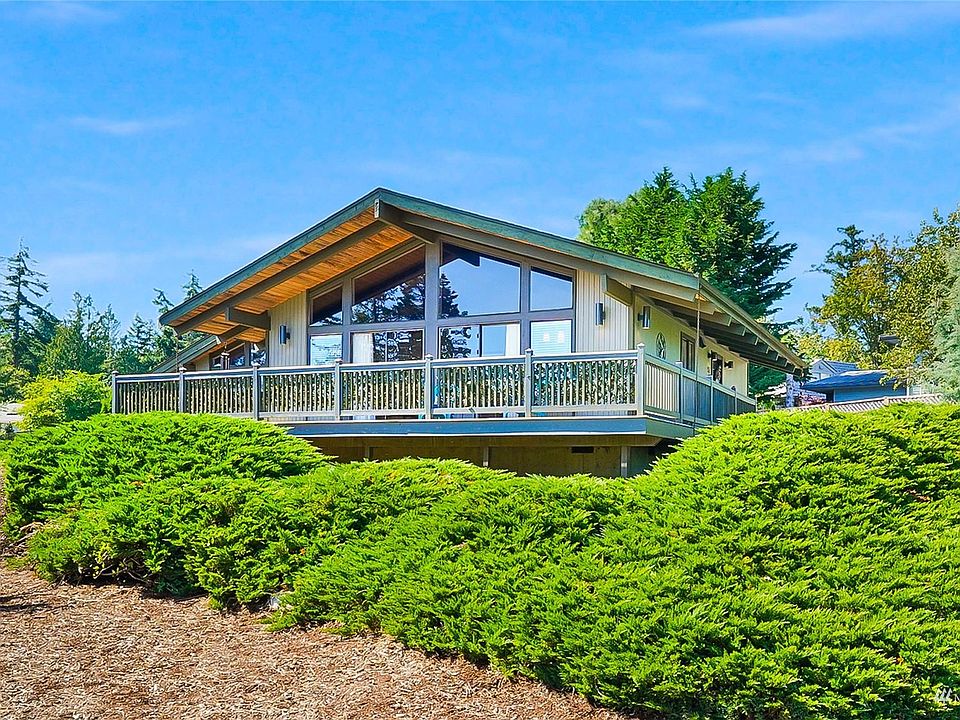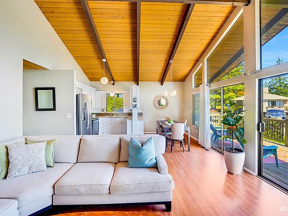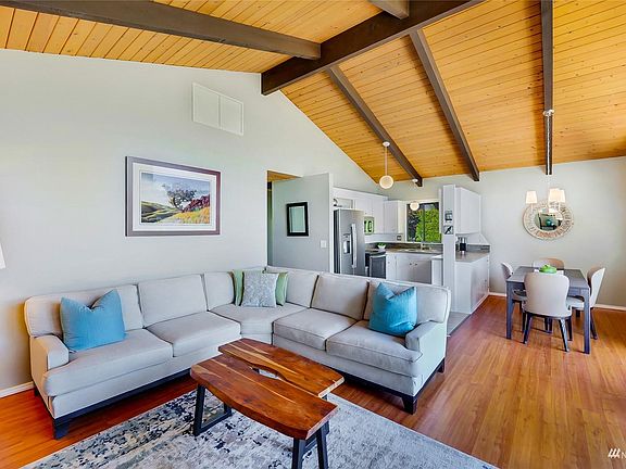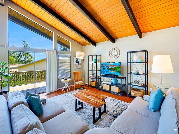 Charming, updated home with wraparound deck in Shelter Bay! Natural light baths this SW facing home on this open & spacious lot! Gorgeous wooden ceilings in most rooms & vaulted in the main living area & primary bedroom! Quaint kitchen with tiled floor & stainless-steel appliances. Beautifully remodeled bathroom with double sink vanity, built in linen closet & rain shower/tub combo. bath is adjacent to the covered deck & could accommodate a second shower addition. Enjoy your fenced yard perfect for gardening, relaxing & entertaining. Bonus features include new A/C Heat Pump & hot water tank in 2022 plus hot/cold outdoor spigot & new garage roof in 2020. Amenities include Par 3 golf course, sports courts, clubhouse, private beach & more.