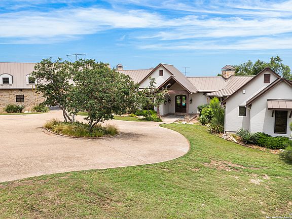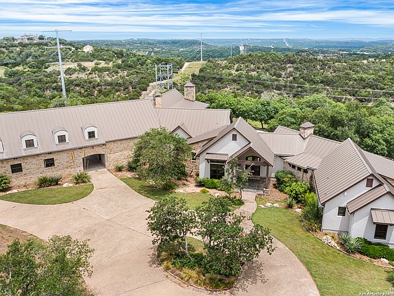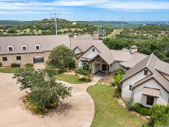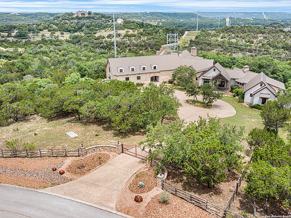 Perched atop a gentle rise and set on over 9 pristine acres, this exquisite 5-bedroom estate combines modern elegance with the rustic charm of Texas Hill Country living. Designed for privacy, comfort, and grandeur, the home offers sweeping panoramic views of rolling hills, native oak trees, and golden sunsets that stretch for miles. As you approach via a private gated entrance the home greets you with stately architecture, and natural stone finishes. Inside, expansive open-concept living spaces feature soaring ceilings with exposed wood floor-to-ceiling windows, and a seamless blend of natural materials. The gourmet kitchen is a chef's dream-equipped with top-tier appliances, a massive island, butler's pantry, and designer cabinetry. Each of the five spacious bedrooms includes walk-in closets and luxurious ensuite baths, with the primary suite offering privacy, spa-style bathroom, and oversized custom closets that are every women's dream. Step outside to a resort-style backyard, where newly refinished pool and spa overlook the undisturbed beauty of the Hill Country. A covered patio with an outdoor kitchen, fireplace, and lounge area creates the perfect setting for entertaining or quiet relaxation. Just minutes from wineries, charming towns, and top-tier Boerne ISD schools.