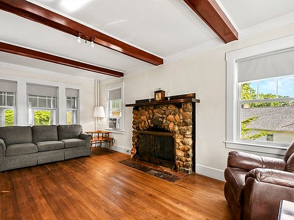 Nestled in a peaceful setting, this updated 3 bedrm residence offers timeless charm and character. As you enter the welcoming foyer you'll immediately feel right at home! The expansive front to back livingrm is a true showstopper ~ featuring rich hardwd flrs, striking beamed ceiling & a majestic stone fireplace that anchors the space and sets the tone for comfortable living. The heart of the home lies in the beautifully remodeled kitchen & dining room where old world built-ins & quality craftsmanship shine. A well planned layout and refined finishes add both function and flair making these spaces ideal for everyday living and stylish entertaining. Unwind on the spacious enclosed front porch or back porch surrounded by lush gre&enery that offers a rare sense of privacy & tranquility. Semi updated full bath and wood floors on second level make the home flow seamlessly. A one car garage & a premier location close to 93, shopping & dining complete the package. Priced well & ready for you!