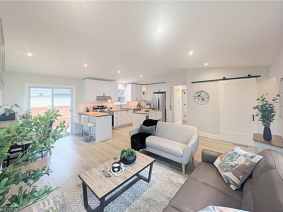 BEAUTIFULLY RENOVATED TOP-TO-BOTTOM…This fully finished 2+2 bedroom, 2 bath bungalow w/IN-LAW POTENTIAL at 52 Valencourt Drive in Welland is nestled on a sunny corner lot, where modern style meets thoughtful functionality. Set on a quiet street, this property boasts eye-catching curb appeal w/NEW siding, windows, porch & fully fenced yard, while a new walkway leads to a welcoming, decorative front door. Step inside to discover a light-filled, OPEN CONCEPT main level enhanced by VAULTED CEILINGS, luxury vinyl plank flooring, fresh paint & trim, and shiplap FEATURE WALL w/built-in electric fireplace. Front entry closet accented by barn door, setting the tone for the stylish touches throughout. The renovated KITCHEN features butcher block countertops, a breakfast peninsula w/extra storage, under-cabinet & in-cabinet lighting, S/S appliances, tile backsplash & moveable island. Patio doors open to a BRAND NEW deck & oversized CONCRETE PATIO, perfect for entertaining or relaxing outdoors. Down the hall, a versatile flex space awaits, perfect for a dining room, office, or extra bedroom to suit your lifestyle. The primary bedroom includes double French doors opening to his-and-hers closets with built-in lighting. A second main floor bedroom & NEW 4-pc bath w/deep soaker tub and stone-top vanity complete the level. With two SEPARATE ENTRANCES to the basement (one from the side door & one from garage) this home is ideal for multi-generational living or rental potential. The LOWER LEVEL features two spacious bedrooms w/egress windows, 4-pc bath, laundry closet & kitchenette w/open living area. Additional UPGRADES include: floors, doors, fixtures, kitchen, bathrooms, all-new ductwork, updated electrical with ESA certificate, new plumbing, tankless water heater, York furnace, AND garage has been newly & fully insulated. A move-in-ready opportunity with exceptional finishings and flexible living potential.