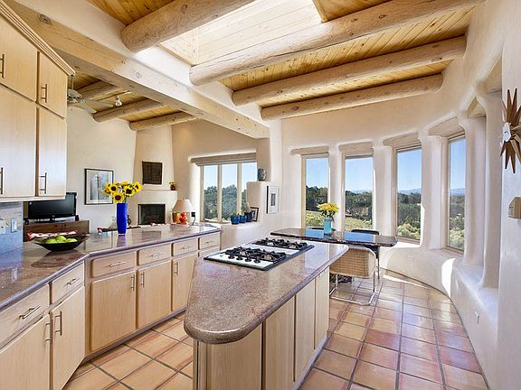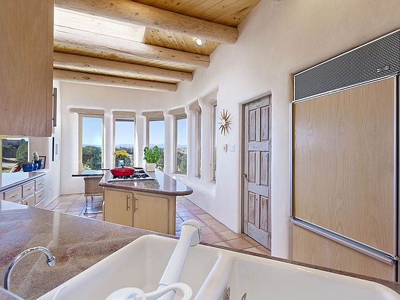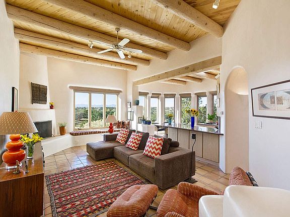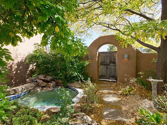 A 3200 sq. ft. double-adobe beauty with panoramic sunset and Sangre de Cristo views, an attached casita and a heated RV garage (workshop). Hand-troweled diamond plaster walls, beautiful archways and vigas are throughout the house, giving it an artistic and organic essence. The back courtyard has the magic of a fairytale with mature wisteria, a waterfall hot tub and outdoor cooking fireplace, a true Santa Fe oasis. The master bedroom is on the main level and the 2 guestrooms are on the upper level of this split-level home. The casita is attached to the main house, and has an exterior entrance as well. In-floor radiant heat. This property is in impeccable condition and just 10 minutes to downtown Santa Fe.