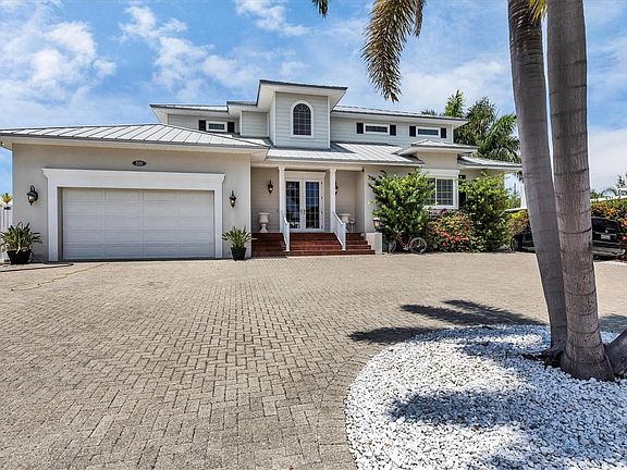 Custom canal front home. Circle paver driveway, metal roof, 2 car garage. Enter the expansive entry way that opens to family room. All overlooking the enormous Pebble Tec heated & cooled pool with sun deck and rock waterfall feature surrounded by the paver deck. There is a boatlift and dock as well. Ready for anything with a full house propane generator. Attention is to every detail featuring custom Plantation shutters throughout, with 24' diagonal tile, high profile baseboards and crown molding. The kitchen is any chefs dream with wood cabinets featuring clear glass lighted fronts and quartz countertops, pot filler above the induction cooktop, Wolf built in griddle and separate deep fryer, 2 Fisher & Paykel dishwasher drawers, Jenn-Air double oven, built in Sharp microwave, Subzero refrigerator, wine fridge and trash compactor in large island with room for barstools. Nothing has been left out! Including closet and walk-in pantry/office. Room for a large dining table and buffet. Wrought iron stair rail leading upstairs or use the elevator to take you from the garage to the Master suite that overlooks pool and canal. Large walk-in shower and jetted garden tub double sinks and two enormous walk-in closets. Downstairs bedroom has en-suite bathroom. Tiled half bath is complete with metal fish sink and chandelier. There are many possibilities to add an additional bedroom or possibly two. Listing agents have blueprints to show options.