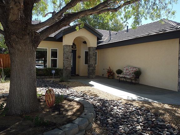 Gorgeous xeriscape front yard w/shade trees,new stucco,tile roof.!Inside 2 arches frame sitting rm;new carpet.Tile leads to heart of home!Cooks kitchen filled w/lots of cabinets & corian counters;ss range, mw,dw,fridge & recessed lights.Pendants hang above sitting area to watch the cooks!Adjacent dining rm has view of back yd.Very lge family rm w/cathedral ceiling has rock fireplace w/hearth & mantle & fan!Builtin buffet @ opposite end.Double french dr leads to patio.Back to hallway,first pass Bdrm 4 has fan,pleated shades,lots of shelves.Guest bath on left has granite counters,2 pendants,enclosed tub.Bdrm 2 & 3 on south side:one set up as office also.Mstr suite has cathedral ceiling, fan,wood laminate floor:french dr to patio!Arch to elegant bathrm:marble counter w/bowl sinks;2 oval mirrors,pendant lights.Walkin closet!Separate rm for soaking tub;glass block window;oh my!Laundry area on way to garage.Back yd has grass w/rock border.Entertaining areas under patio & under stars & lites!2 lge sheds & grapes on s. side.Carport on south side has lge metal gate to driveway.Brand new AeroCool on grd;8"pads.Water heater 3 yrs old.Finished garage w/opener & workbench.So many upgrades!!