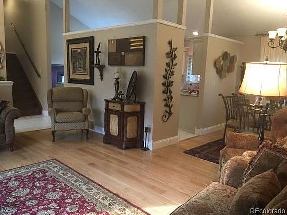 Beautiful Rockrimmon home in move-in condition. Vaulted living room with hardwood floors that flow through the dining room, bright and cheerful updated kitchen with vaulted ceiling, granite counter and decorative tile back splash, breakfast nook and walk-out to the covered deck. Spacious lower level family room has a gas fireplace with blower, new carpet, built-ins and walk-out to the patio and a private back yard. Upper level master bedroom with his and her closets and adjoining updated master bath, two secondary Bedrooms and full bath upstairs and a 4th bedroom and bath downstairs. Rec room, plenty of storage, A/C , water softener, beautiful mature trees and landscaping and a fenced back yard. Immaculately maintained and ready to call home. Brand new high impact resistant roof late 2016. Real hard wood flooring in living and dining room.