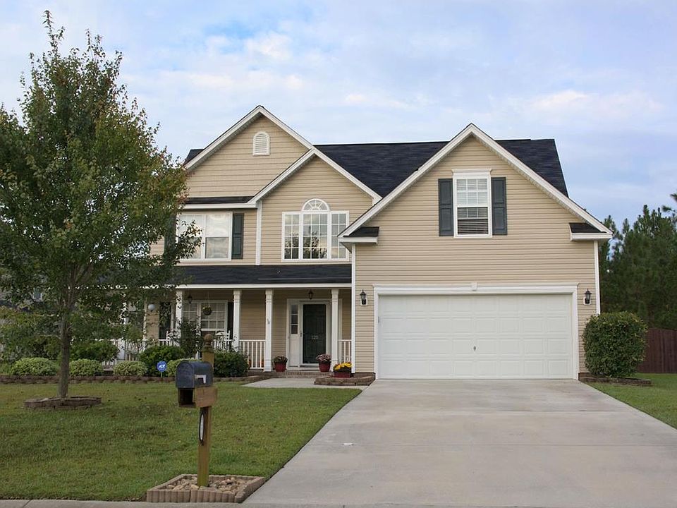 Large 4 bedroom, 2.5 bath in Patriot Landing near Shaw AFB. Inviting 2 story foyer, kitchen opens to family room and has oak finished cabinets, nice sized pantry, eat-in area, and breakfast bar; tray ceiling and walk-in closet in master bedroom; master bath has double vanities, garden tub, and separate shower. Covered front porch, double patio in back, sprinkler system and privacy fence. Granite countertops in eat in kitchen, cultured marble in baths. Bonus room over garage w/o closet can be used as a 5th bedroom and has a split HVAC. New photos coming soon!