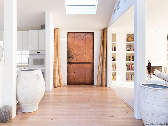 This is a rare opportunity to own one of the most unique properties in Ulster County. Exquisitely designed inside and out, this home offers a dome of zen privacy that allows you to escape the outside world. Enter the 65 acres of meadows and woodlands through a hand-forged electric gate into a sanctuary just 10 minutes from Uptown Kingston. This sun-drenched mid-century home has been completely reimagined from the ground up with no detail of design or comfort left unturned. A wall of sliding glass doors in the the living room provides sweeping views across the elegantly designed south landscape with custom-built rolling stone walls unequaled in a private residence. The living room's gas fireplace keeps the white interiors pristine while still providing the loft-like common space with the comfort of a constant flame at the click of a button. In-wall and ceiling speakers connect to your sound system to drench the space with music. Floor length white Bali blinds drape all the windows and doors to softly diffuse sunlight while adding privacy. Materials and design elements are consistent throughout the home providing a soothing sense of unity and tranquility. The open kitchen with bleached, wide-plank floors is a cook's dream with brilliant white cabinets, double Dacor ovens and a Jenn Air down-draft cooktop. The dining room comfortably seats twelve and has its own wall of sliding glass doors looking west to the pool below and up into the forest. Wrapping around the back of the house is an extensive, multi-level patio with gas fire pits and a four season outdoor kitchen that rivals most indoor kitchens for size and convenience. The main gas BBQ grill is fueled by the propane tank that feeds the house so there's never a need to change a portable tank or run out of fuel. The same propane tank fuels the Kohler Generator that keeps the house, pool and spa powered, lit and comfortable should a power lapse occur. And for those days when we return to larger-scale entertaining, the outdoor kitchen is also the perfect workstation for a catering company, offering private access to the driveway so the transport of food and gear would be invisible whether entertaining inside or out. Driveway annunciators line both the main and the utility driveways so no one enters the property without a warning chime. The house is also equipped with a remote and key coded alarm system with exterior surface-mounted security cameras along with an E-ZPass driveway camera to spot check license plates. While all of the bedrooms boast cathedral ceilings and modern propeller-styled fans, the two main suites also have oversized sliding glass doors to step onto the patio decks without having to go through the common areas. Access from the primary bedroom is down a spiral staircase that leads to a six person hot tub. For continuous access during winter snow the decking around the hot tub and kitchen has integrated heat coils so there's never a need to shovel. The design goal was a full integration between indoors and out. Almost every room in the house has direct access to the outside providing a haven that embraces the Hudson Valley outdoors year-round. From the back decks, follow the hill down the winding stairs to the heated, free-form, salt water pool. For night time relaxing, the entire yard is illuminated with custom-designed low-voltage LED path, posts, spot and bistro lighting. And for those days when you just don't want to leave the pool area there is a second outdoor kitchen and gas grill steps away that is fueled by a separate in-ground propane tank which also ignites the eight foot custom stone fire pit overlooking the pool.