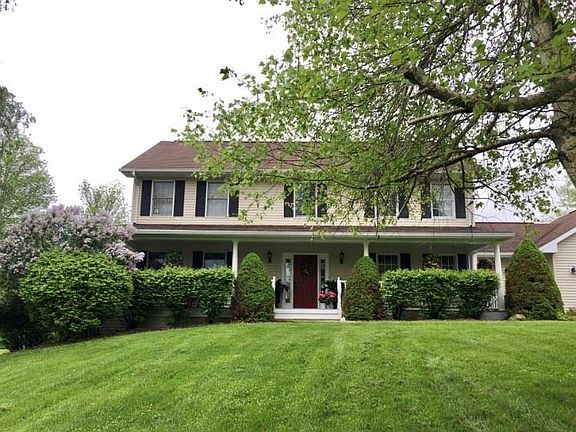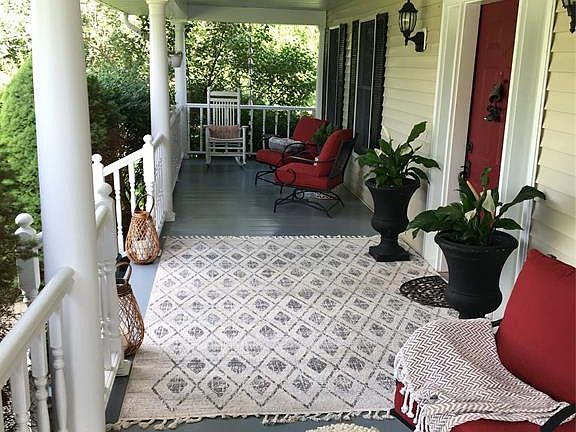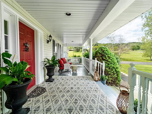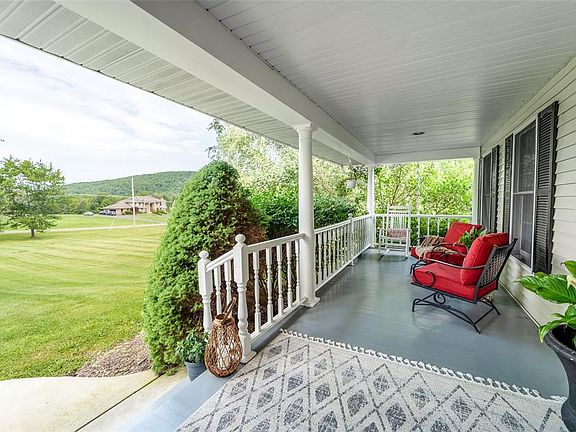 Gorgeous two-story home sits in the center of a 7.4 acre manicured property with private entrance and setting. Includes a stunning wrap-around porch, 5 bedrooms, 2.5 baths, whirlpool tub, quartz kitchen and breakfast bar, gleaming oak floors and tile throughout, gas fireplace, fresh paint, 6-panel doors, finished walk-out basement (plumbed for another bathroom), two-car oversized garage, grid solar panels (electric bill approx. $15/mo - yes you read that right!), beautiful fenced in Coral Isle in-ground pool with new liner, pool house, new wifi-connected energy efficient hot water heater, new septic pump, new french drains and a 4 acres lot with invisible fencing. Possibilities galore with the property! Take a walk to a path with a pumpkin patch, fruit trees, and a beautiful creek with waterfalls.
