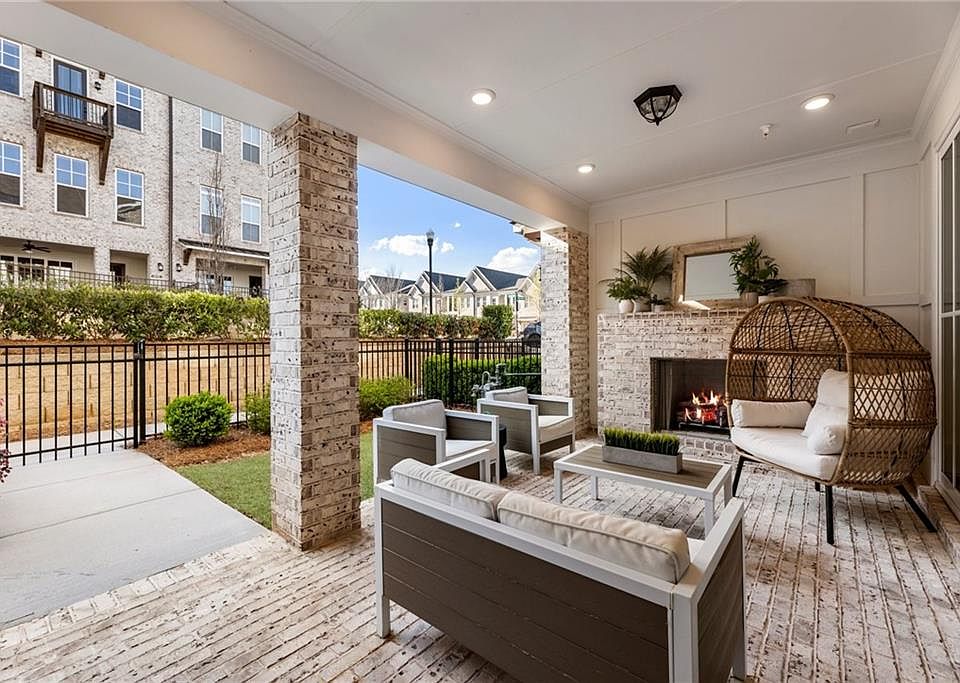 Stunning Atley townhome in downtown Alpharetta. Fall in love with this like-new home. If you have been looking for a townhome that is not on a busy street, is in perfect condition, has a fenced yard and outdoor living space... this is the one. As you come to the front entrance you pass through the private gate to the small yard and enter the covered front porch, complete with gas fireplace. First floor has a wonderful sitting room with upgraded sliding doors that open wide to the front porch; excellent space for family and friends to hang out together. Upstairs main living area features a gourmet kitchen (quartz countertops, walk-in pantry, cabinets to the ceiling, gas range with vent hood, and more). Breakfast bar easily seats four people. Behind the kitchen is the perfect office space (or play room) with sunny deck, half bath and laundry. Kitchen overlooks the open concept dining room, and fireside great room with deep built-in shelves and floor to ceiling windows. Upstairs find the master suite, plus 2 additional bedrooms with shared bath. Master bath has double vanity, oversized shower with dual shower heads and beautiful cabinets, countertop and tile work. Large walk in closet features loads of built-ins. Both secondary bedrooms also have large closets and decks to enjoy the fresh air. Hardwood floors throughout all rooms except the 2 secondary bedrooms. Tankless water heater, loads of closet space and neat as a pin. Atley is a gated community with dog park, swimming pool and access to the fabulous AlphaLoop. An easy walk to downtown Alpharetta, or grab your bikes and head to Avalon or The Greenway. Super convenient to GA400 and all that Alpharetta, Milton and the north Fulton community have to offer including exceptions schools.