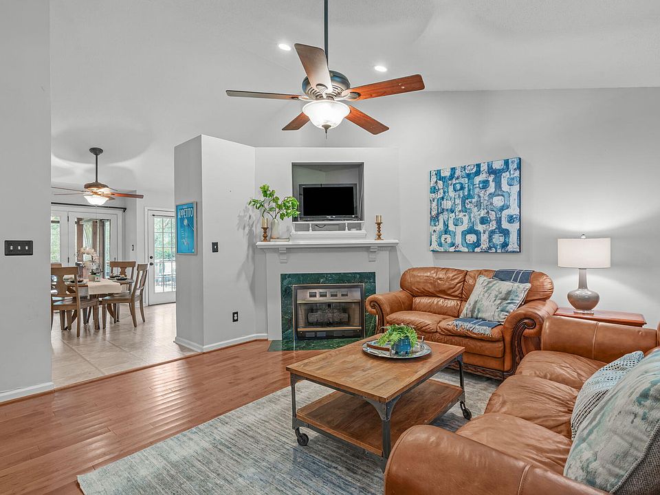 Lovely Ranch Home on nearly an acre, your private country oasis! This 3 bedroom, 2 full bath ranch sits on a private .78-acre lot with no HOA and offers the perfect blend of charm, comfort, and functionality. Hardwood floors flow throughout the family room and all bedrooms, and a rocking chair wrap-around front porch welcomes you into a family room with vaulted ceilings and a cozy fireplace. The entertainer's dream kitchen features a generous layout designed for cooking, hosting, and everyday living, while the oversized screened porch overlooks the huge backyard and pool, creating an outdoor paradise with plenty of room to relax, play, and entertain. The owners suite includes a walk-in closet, a luxurious garden tub, a separate tiled shower, and a double vanity for added convenience, while two additional bedrooms and a second full bath provide flexible space for family, guests, or a home office. Additional highlights include a 2023 HVAC system, storage shed, and a private wooded setting that offers peace and privacy. This is the country retreat you have been searching for!