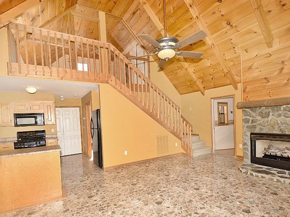 Long range mountain views from this lovely 2BR/2BA chalet nestled in beautiful Country Mountain Ridge Subdivision. This lovely home features a bonus room which could be used as craft room, office or bedroom. Family friendly chalet is sunny & bright with wood beamed ceiling, new gas log fireplace, gas stove & has been freshly painted. The oversized two car garage is attached by an enclosed, handicap ramped breezeway. The loft BR with en suite bath is glass enclosed to provide privacy while enjoying the mountain views. There is a chain link fenced area in the yard for pets on the one acre lovely landscaped lot. This is a lovely subdivision with paved roads and well kept homes. Welcome home!