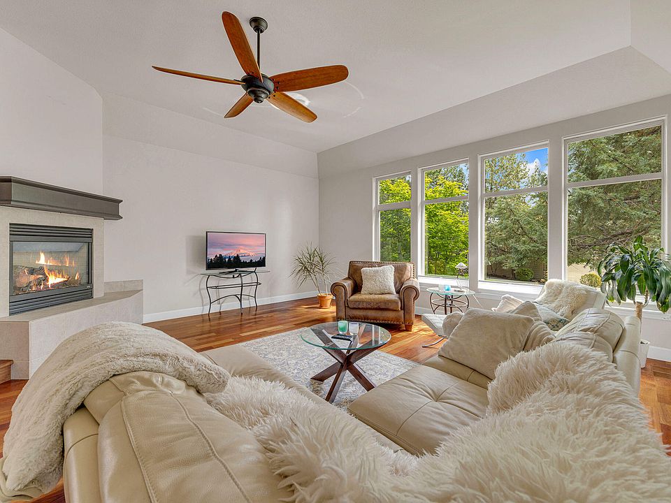 The chef's kitchen includes quartz counters, stainless steel appliances, large breakfast bar, and a central island with cooktop—flowing into a bright Great Room with a gas fireplace and vaulted ceiling. Each bedroom is generously sized and filled with sunlight. The primary suite is a private retreat, complete with a cozy sitting area, jetted soaking tub, tiled shower, and direct access to the backyard.