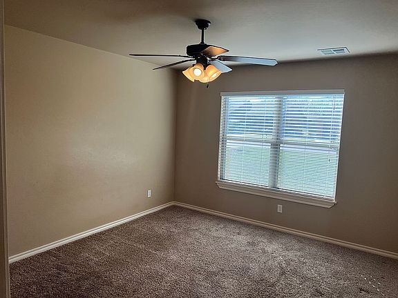 Storm shelter and water softener in two car garage, custom wood blinds on all windows