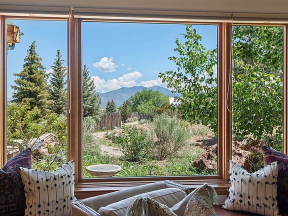 Here’s the beautiful setting and property you’ve been looking for in Taos! An acre with great views and lots of big trees affords wonderful outdoor living, and there’s a fabulous huge portal wrapping around the home. The residence is full of charm, light and bright with a very comfortable open floor plan, and the colorfully updated kitchen and bathrooms are quite appealing. The portal offers plenty of space for seating and dining, and it includes your own home spa with a new hot tub and large Finnleo sauna. The bonus is an outbuilding with a big six-car carport, plus two nice workshops, and a small storage/studio area. About three quarters of the lot is enclosed with coyote fencing and an electronically-controlled gate. The property is just a short distance to lots of hiking, biking, or horseback riding trails in the national forest. It’s a convenient location close-in, yet with a lovely rural feeling, and the views of Taos Mountain and the Sangre de Cristo foothills are gorgeous!