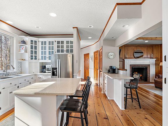 Outdoor living is a highlight, with a newly installed maintenance-free deck where you can take in the scenic beauty of the backyard. The home is also equipped with a newer roof, ensuring peace of mind for years to come. Interior details include a stunning beamed ceiling and wide plank wood floors that add warmth and character to the space. Cozy up to one of the three wood-burning fireplaces, which also offer the option to convert to natural gas for added convenience. A unique feature of this home is the bonus space located above the garage, which presents an exciting opportunity for additional finished living space, a private home office, or a creative studio. Alternatively, it functions perfectly as extra storage. Most of the windows have been replaced with high-quality Marvin windows, enhancing both energy efficiency and aesthetic appeal.