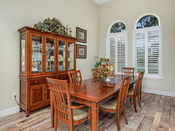 Every corner of this stunning waterfront pool home has been tastefully updated and meticulously cared for including new roof in 2019 and hurricane impact windows and doors in 2021. With soaring ceilings and an open split plan layout, this home functions perfectly for a large family or a couple that needs office space and privacy for their guests. The backyard has a salt water sports pool with peaceful views of the water as well as a fenced in area great for children or pets. There is plenty of room to store your toys in your oversized three car garage. Located in the desirable Woods at Iroquois in South Merritt Island, you will be close to rocket launches, the beach, rivers and all the conveniences of shopping and restaurants.