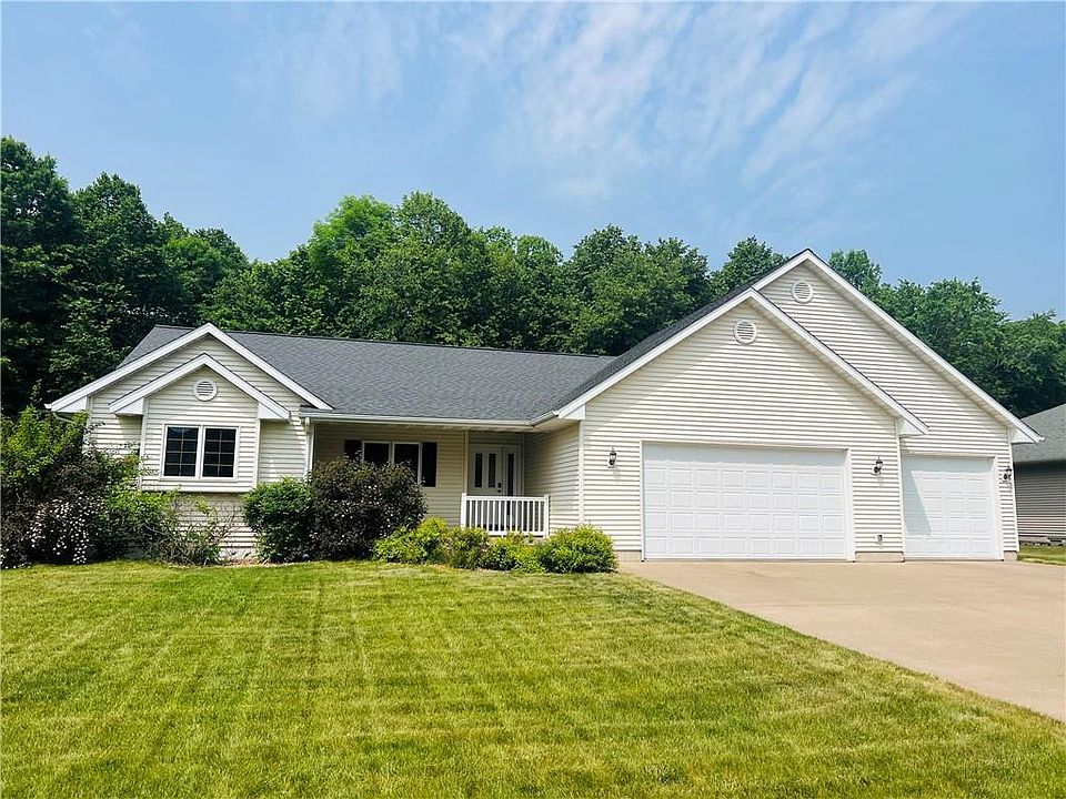 This custom built ranch style home is located in a very desirable neighborhood. The home sits on a unique lot in that borders Scharbillig-Jones Memorial Woods that is owned by the City and the woods also adjoins Roux Park on the backside. You will love the spacious open concept of this home with vaulted ceilings in the living room and a gas fireplace. There is a spacious main floor laundry room with many cabinets and a large master bedroom suite that features a walk in closet and private bath with a separate shower, large jetted tub and double sinks. There is an attached 3 car garage and the full basement is currently unfinished but it does have a 4th bath stubbed in and a large egress window in place if you wanted to add a fourth bedroom. This house is conveniently located near medical facilities and the schools with easy access to Highway 53.