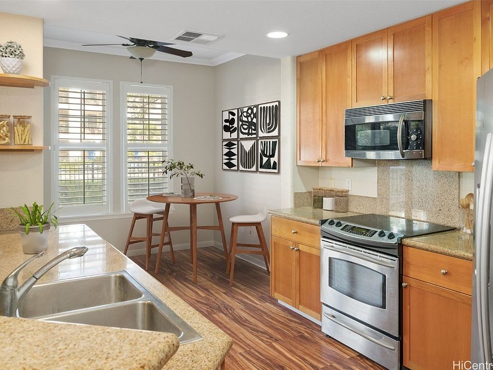 Discover the essence of island luxury in this beautifully updated ground-floor unit within the gated Hawaii Kai Peninsula community. Offering three spacious bedrooms, modern comforts blend seamlessly with resort-like amenities. Enjoy high-quality laminate flooring, elegant vinyl shutters, and a modern kitchen with the latest appliances. The private lanai and central AC provide comfort and relaxation at your doorstep. The master suite features a double vanity bathroom and ample walk-in closet space, ensuring privacy and convenience. Residents benefit from exclusive access to marina views, fitness and recreation rooms, two saltwater pools, whirlpools, and a playground, along with ample guest parking. Positioned near schools, shops, and transportation, this pet-friendly community with walking paths and dog parks is perfect for an active lifestyle. Experience the perfect blend of comfort and convenience in a vibrant Hawaii Kai setting.