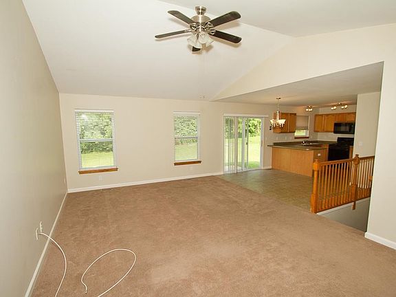 Ready to move into! great vaulted open floor plan with 3 bdrms 2 baths plus main floor laundry-large kitchen with center island/breakfast bar, pantry and sliding glass door leading to patio-backs to woods-New dishwasher & microwave installed in 2018-2 car garage-Basement has rough in plumbing and large look out window, ready to be finished