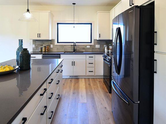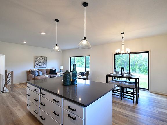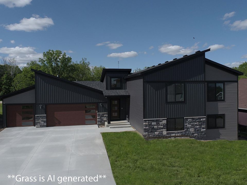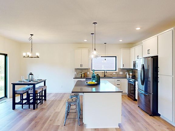 This beautifully crafted home seamlessly blends mid-century modern design elements with contemporary conveniences, crafting a chic & welcoming environment, perfect for entertaining & family living alike. Large primary bedroom boasts tray ceiling, walk-in closet with custom tiled walk-in shower. Kitchen features granite tops, ss appliances & open concept. Walkout basement features large 4th & 5th bedrooms, 3rd bath, & expansive living room with gas fireplace. Price includes tape, mud, paint, insulation, & gas heater installed in the garage. Other extras include: 3rd stall garage opener, gutters, & landscaping. Located just steps from the back 9 of the Zumbrota Golf Course, this new construction home offers a peaceful, serene setting while allowing for an easy commute to either Rochester or Twin Cities. This one is a must see!