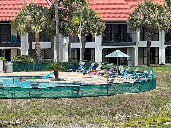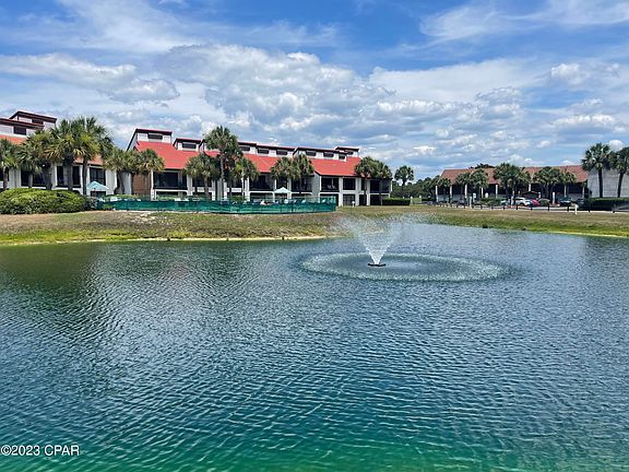 This extra-large End Unit at popular Edgewater Beach Resort is a coastal oasis in a beautiful location. It is offered fully furnished and will be a strong rental with just a few more updates. Sellers have owned for 15 years, and it is a well-maintained, non-rental condo on the second floor (no elevators). Enjoy a tranquil pond view through floor-to-ceiling windows to the inviting Villa pool. Relax on the private, covered patio for morning coffee, breezy nap or evening meal. The spacious owner's suite has balcony access and an en suite bathroom with walk-in tile shower. The oversized second bedroom easily accommodates two queens, features its own private balcony, and has convenient access to the guest bathroom. There is a full kitchen with updated cabinetry, breakfast bar, dining area, pantry and standard-sized laundry. This special condo is just across the street from Edgewater's secure beach access and unparalleled waterfront amenities - walk the skybridge or grab the tram! Indulge in the true resort lifestyle that Edgewater promises with tropical pools, hot tubs, waterfalls and breathtaking sunsets. The incredible onsite Ocean's Restaurant & Bar serves delicious food and is unmatched by any other local resort. Edgie's Corner Market promises everything you forgot at home, fragrant Starbucks, refreshing ice cream, and more. Get active with golf, tennis, pickleball, shuffleboard or time in the fitness center. Bella Salon services available by appointment. Fun splash pad and planned activities for the kiddos. Gated street and beach entrances for peace of mind. There is incredibly convenient, gated building-side parking with dedicated spaces for electric vehicle charging, RVs, boats, and trailers. Walk to shopping, dining and entertainment right across the street at The Shoppes. Only minutes from exciting Pier Park and PCB's only dog beach!