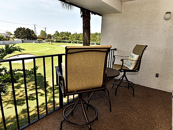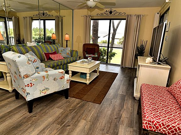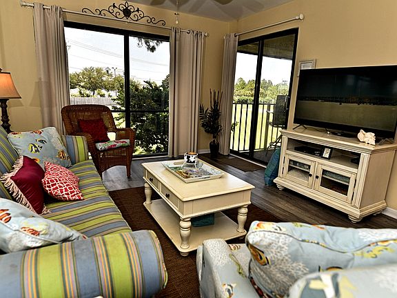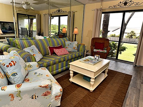 Updated, pretty 2nd floor Villa with tranquil golf course view of Hole 3. Modern kitchen featuring granite, stainless, raised ceiling. New AC. Beautiful easy care wood flooring, wainscoting accent. Spacious with a private balcony full of coastal breezes and sounds of the surf. Large Bedroom with it's own bathroom. Nice furnishings and decor - ready to earn rental income - 2019 Gross $25,200. Pet friendly for Owners! Steps to heated Villa pool. The beachfront amenities are a short walk or tram ride away: Beach Access, Tropical Pools, Hot Tubs, Sun Decks. Restaurant, Poolside Bar, Market, Pizza Shop. Kids Club with Splash Pad, activities. Owners play UNLIMITED Golf, Tennis, Shuffleboard. Fitness Center, Salon services. Gated Entrances, 24-hr Security. Walk to dining, entertainment, shopping