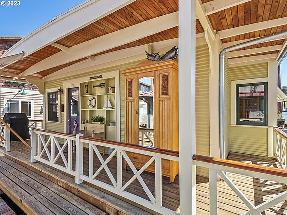 Front OWNED Slip, Back patio facing the open river (South VIEW), Tomahawk Island floating home Community with low dues and fractional ownership in the moorage. Relax and enjoy the peace and tranquility of life on the Columbia. Covered deck for outdoor dining or sitting back watching the river curled up with a good book. Soak up the sun on the 360 sq./ft. swim float with room to moor a boat and swim ladder. Come inside and cozy up to the gas fireplace with water views and tons of natural lighting out of every living room window. Finishes: Custom Railing all around, Shiplap walls in the bedroom and tiled bathroom. Clear cedar ceiling and accent wall in the living room. Barn door, textured wallpaper with Magnolia paint. Nuts and bolts: natural clear cedar floor and ceilings in deck. New Marvin wood double pane windows, aluminum clad exterior. New pex plumbing, all new electrical, exterior paint, mini split heat/air, quartz counter and dishwasher. Steel H Beam stringers were installed 2019, new encapsulated flotation added 2020. Wonderfully restored and a well-thought-of floor plan would make anyone feel at home. Amazing for entertaining, or just sit back and enjoy watching the day slip away.