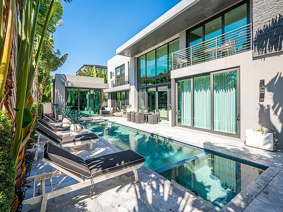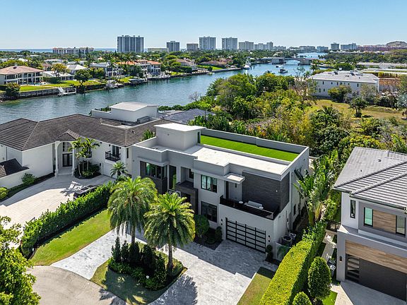 Tucked away on the smallest, most private cul-de-sac in Golden Triangle, a dramatic three story contemporary ultra custom residence is right beside Boca Raton's downtown intracoastal waterway. The sleek, modern facade captivates with bold geometric lines, floor-to-ceiling glass windows, a striking mix of smooth stucco and textured stone accents. The grand entrance, framed by custom glass doors and dark stone cladding, sets the stage for the exquisite interiors .Walking distance to the ocean and downtown Boca. East of NE 5th Ave the main house features a two story great room, open kitchen featuring Sub-Zero and Wolf, MAIN floor primary suite and full en-suite bedroom. The second level features three ensuite bedrooms (one currently used as a loft) a full theater, exercise room and office.