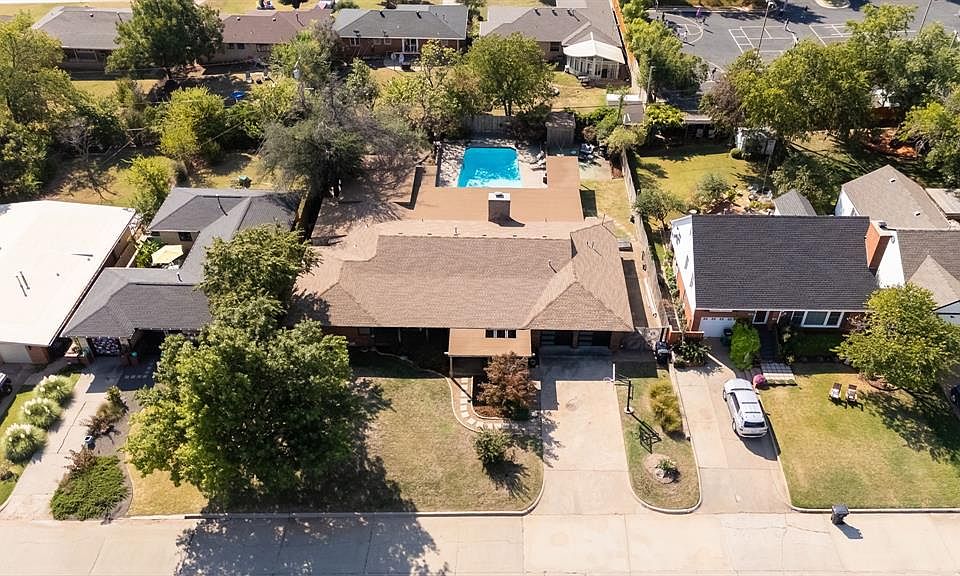 Incredible opportunity to own a sprawling mid-century gem in Douglas Park. Right across the street from the park, it offers incredible views and access to the park. The home is on a huge lot with captivating curb appeal and a fantastic covered front porch complete with a cozy swing—perfect for relaxing and enjoying the serene neighborhood and park views. Inside, the spacious nearly 4300 square feet of living space offers an inviting open-concept design in the living and dining areas, centered around a warm wood-burning fireplace. The updated kitchen is perfect for modern living, offering plenty of space for cooking and entertaining. The large back room provides flexible living space and mid-century cool with its terrazzo floors. It also offers beautiful views of the backyard and the large, sparkling pool. With a vast pool deck and expansive covered patios, the backyard is a true oasis for outdoor enjoyment. Back inside, the primary suite is a retreat with a sleek en suite bath, walk-in closet, sitting area and private access to the pool. One secondary bedroom also has an en suite bath, and two more bedrooms are off the hall bath that serves all the mid-century vibes. Other items to appreciate are hardwood floors, brick accents, laundry room, garage... Priced with the financial margin for you to put your own touches on the home if you wish, this is an excellent opportunity. Make a savvy buy and live in the heart of OKC's most beloved vintage and historic neighborhoods and enjoy all the dining, shopping and entertainment of our favorite districts.
