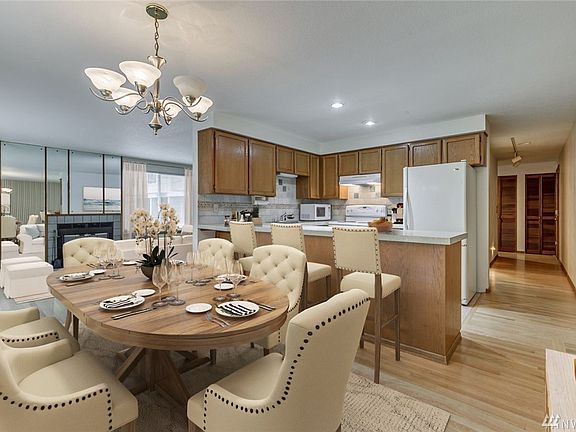 Outstanding location! Walk to shops, restaurants, beaches, parks and the Farmer's Market in downtown Edmonds! Stunning renovations to the exterior, common areas, and landscaping were just completed. Enjoy the spacious floorplan on the first floor. Large living room with fireplace for those cozy evenings and opens to private deck. Dining room flows to a generous sized kitchen. Roomy main bedroom with attached full bath and balcony. Second bedroom conveniently located near 3/4 bath and would be a great guest room or office/den. Plenty of storage and full size washer and dryer in unit. Dedicated one car garage + designated parking space . Newer heat pump and hot water heater, don't miss the AC! HOA in excellent shape. Welcome home!