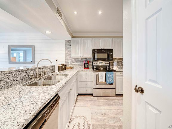 UNDER CONTRACT WITH CONTINGENCIES; SELLER ACCEPTING SHOWINGS AND BACKUP OFFERS. This area in Edgewater Golf Villas is called Beachview for a reason - views of the Gulf of Mexico from the front porch and the back porch! Own your piece of paradise! This beautifully remodeled Golf Villa Resort condo offers an incredible investment opportunity and won't be available for long. Nestled in an unbeatable location, this 2-bedroom, 2-bathroom unit overlooks a scenic pond and the first hole of the golf course. It's ideally situated next to the walkover bridge, providing easy access to the beach. Inside, you'll find all the latest updates and brand-new furnishings for a luxurious living experience. The bright and spacious living room features new hurricane windows and plantation shutters, while the primary suite offers a chic barn door and a fully remodeled bath with a soaking tub. The entire unit boasts ceramic tile faux wood flooring. The second bedroom, complete with an en suite bathroom, provides ample space for guests and includes a private balcony and two closets. This villa is located in a vibrant resort with an array of amenities: multiple pools, a spa, a 9-hole golf course, a fitness center, tennis, pickleball, basketball, shuffleboard, a pro shop, a par-3 golf course, and a convention center. A tram runs throughout the day, offering convenient transportation to the beach and other spots within the property. Highlights include a Lagoon-style resort pool, hot tubs, heated pools, a kid's splash pad, and a casual dining restaurant and grill. You'll also find a corner market, a Starbucks coffee shop, and an ice cream shop. With over 11 pools on the property, this villa is within walking distance of local restaurants, shopping, skating, and bowling. Whether you're looking for a permanent home, a vacation getaway, or an investment property, this villa offers unmatched amenities. Fully furnished, it includes a tankless water heater, a dehumidifier, recessed lighting, shiplap, wainscoting, and more. This villa is truly a must-see!